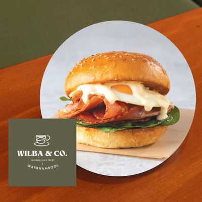 WILBA'S FAMOUS BREKKY ON THE GO! YOUR CHOICE TO ADD A PROTEIN FILLER, WITH FRIED EGG, SPINACH, HASH-BROWN, HOLLANDAISE SAUCE, SANDWICHED IN A TOASTED MILK BUN BURGER.
