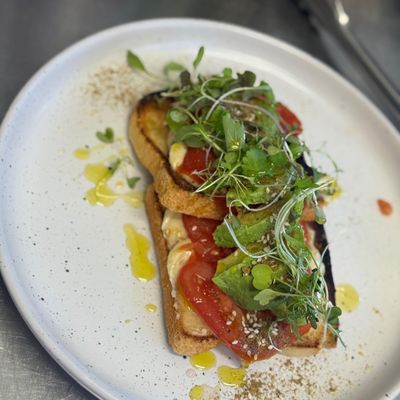 TOASTED SOURDOUGH, FRESH TOMATO, HUMMUS, DUKKAH SPICE, SLICED AVOCADO (vegan)