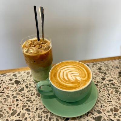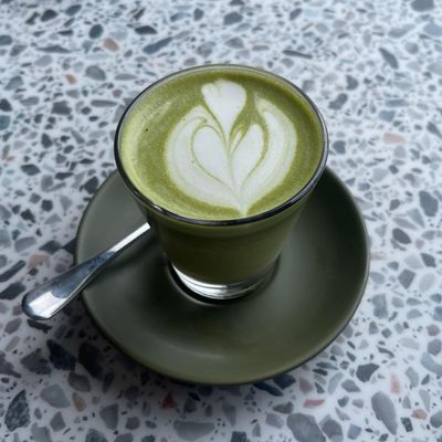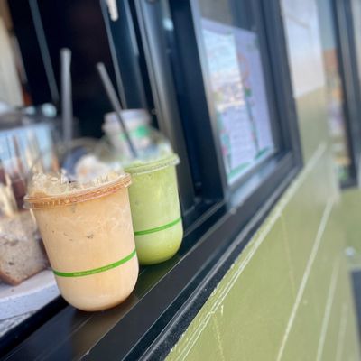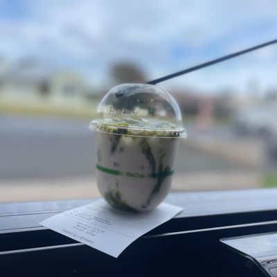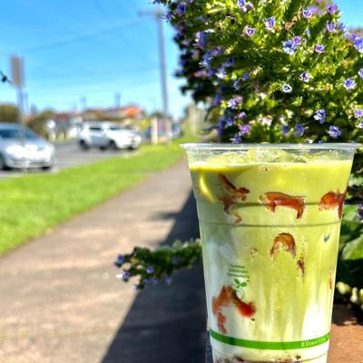 a summer favourite! this is a layed drink of sweet strawberry coulis, cold miilk of your choice, 100% pure matcha over ice. Best with oat or coconut m*ilks.