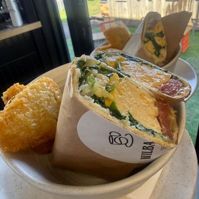 BREAKFAST BURRITO SCRAMBLED EGGS, CHORIZO, AIOLI, ROCKET, PROVOLONE CHEESE, CARAMELISED ONION, TORTILLA, SIDE HASHBROWN +4.0