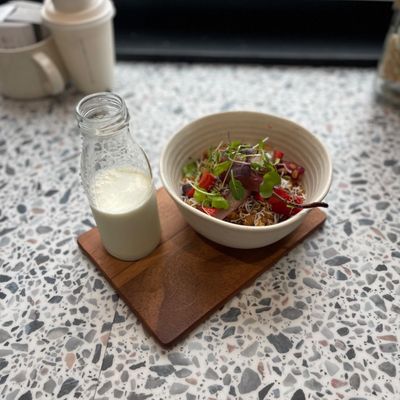 WILBA’s HOUSE MADE RECIPE OF NUTS, SEEDS, WHEAT OATS, CONTAINS GLUTEN, COCONUT YOGHURT, FRESH FRUIT, COMPOTE, SIDE MILK