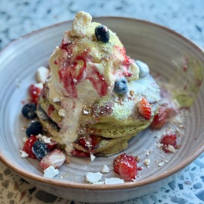 TRADITIONAL FLUFFY PANCAKE, WITH YOUR CHOICE OF TOPPING FRESH BANANA, BLUE BERRIES, STRAWBERRIES, MAPLE SYRUP, ICE CREAM, MATCHA SPREAD