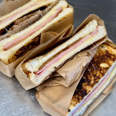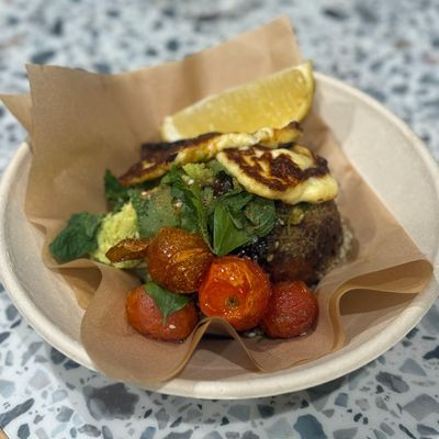 TOASTED TURKISH SLAB, WITH RELISH, AIOLI, CHEDDAR CHEESE, SPINACH, GRILLED HALLOUMI with your choice to add EGG &/or HASHBROWN