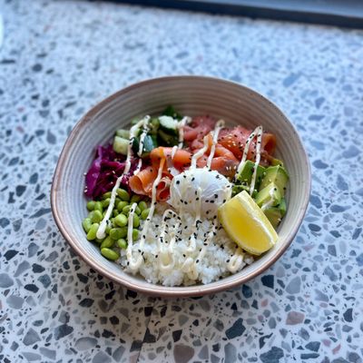 RICE, GINGER, EGG, KIMCHI, MISO-SESAME DRESSING, KEWPIE, BEANS, CUCUMBER, AVOCADO, SEAWEED FLAKES DON’T FORGET TO ADD YOUR SALAD PROTEINS: GRILLED HALLOUMI, AVOCADO, COLD SMOKED SALMON, POACHED EGG, PANKO CHICKEN (+6.0each)