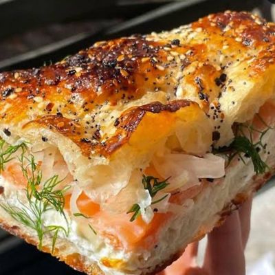 FRESHLY BAKED FOCACCIA, ROCKET, CREAM-CHEESE MIX, LEMON ZEST, CORNICHONS & DILL, COLD SMOKED SALMON ADD IN AVOCADO and/or HALLOUMI