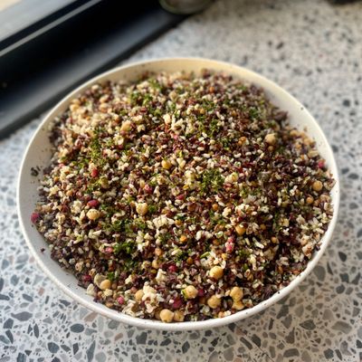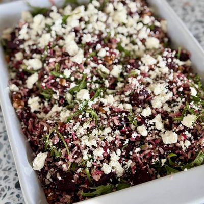 POACHED BEETROOT, LENTILS, BLACK RICE, HERBS, NUTS, SEEDS, TAHINI DRESSING, HUMMUS CATERING BOX FEEDS 6-12 PEOPLE AVAILABLE AS ONE OR INDIVIDUALLY PACKED.