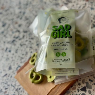 KNOT MATCHA I CAN DO ABOUT IT MATCHA CHOCOLATE COVERED PRETZELS 110g contains DAIRY & SOY. GLUTEN. PEANUTS. TREE NUTS.