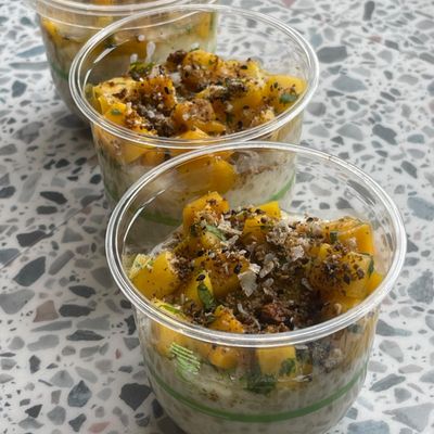 Cardamon infused coconut cream, tapioca pearls, fruit salsa, toasted coconut & nuts in a takeaway pot. Part of our Grab & Go Menu! This is a gluten free friendly option. Whilst we try our best to offer gluten free friendly meals, we cannot safely claim to be celiac friendly.