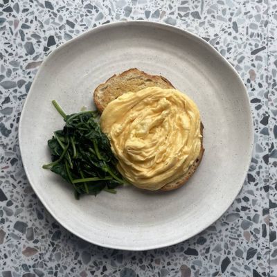 SCRAMBLED EGGS, CHILLI OIL, FRIED SHALLOTS, ROAST PEPPERS, FETA CHEESE, SALAD, OPTIONAL BREAD ADD-ON BREAD CHOICE: SOURDOUGH, GLUTEN FREE BREAD, PRETZEL, CROISSANT