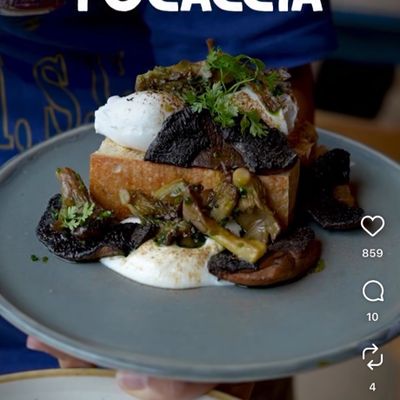 TOASTED FOCACCIA SLAB, TOPPED WITH FIELD MUSHROOMS, CREAM-CHEESE-TRUFFLE-FETTA WHIP, POACHED EGGS, CRUNCHY KALE, PARMESAN
