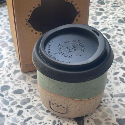 Padre branded reusable ceramic cup with lid. Sage green. 8oz size.