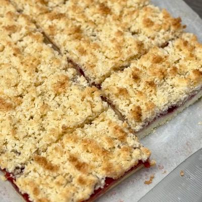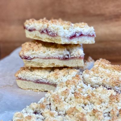 Biscuit base topped with layers of raspberry jam and coconut meringue.