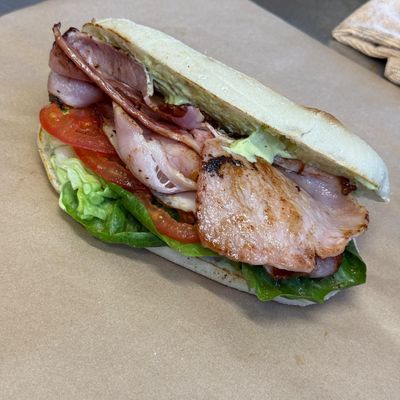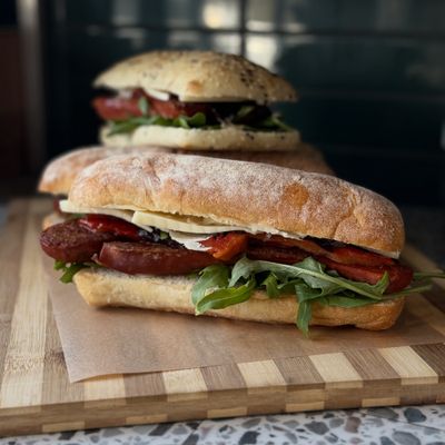 BACON, LETTUCE, TOMATO, CHIPOTLE AIOLI, TOASTED CIABATTA ROLL (ADD AVOCADO or HALLOUMI +5.0each)