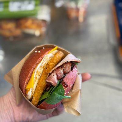 BACON, FRIED EGG, RELISH, TASTY CHEESE, TOASTED BURGER BUN