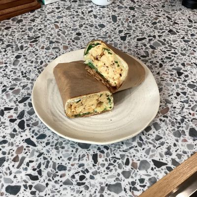 TORTILLA WRAP, SCRAMBLED EGGS, TOUCH OF CHILLI, ROCKET, AIOLI, TASTY CHEESE